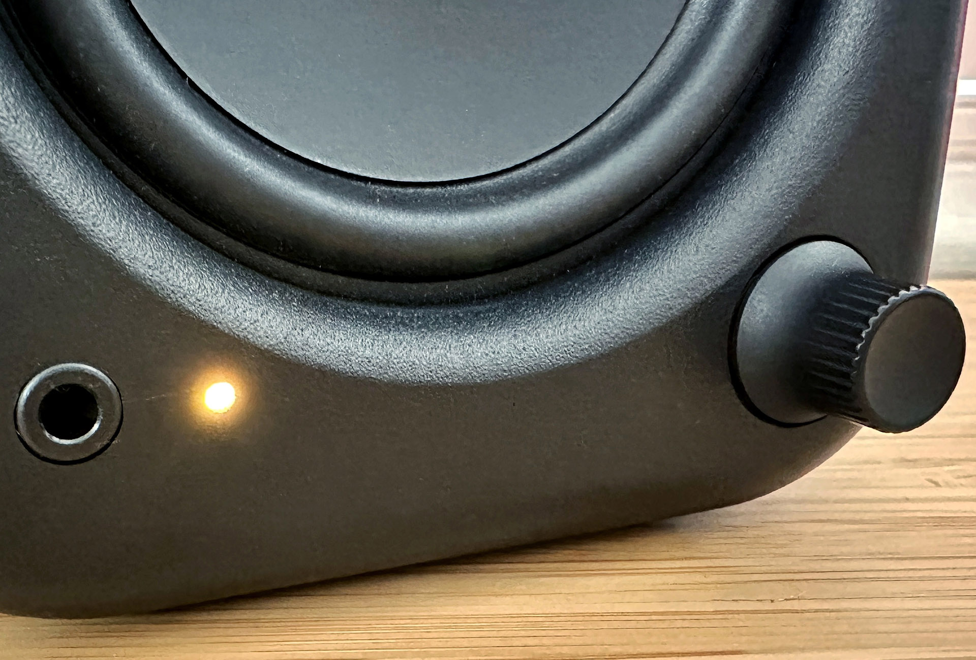 На передней панели «ведущей» колонки размещён поворотный регулятор. Он отвечает за выбор входа, громкость и питание. Небольшой светодиодный индикатор показывает, какой вход активен. Также имеется 3.5-мм выход для наушников.