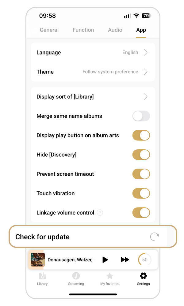 Откройте приложение → Нажмите [Настройки-Приложение] → Выберите [Проверить наличие обновлений].